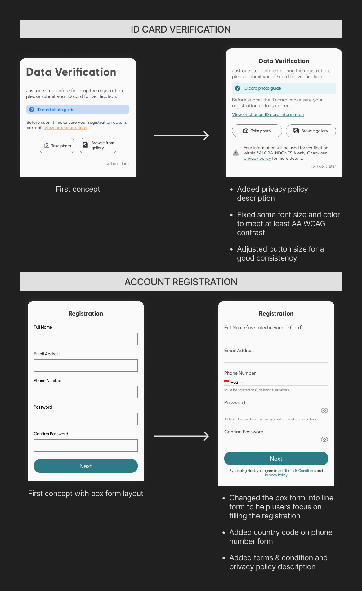 I designed these registration pages by following the typical pattern of similar applications, so new users can quickly go through the process. Preferably, users must verify their ID to avoid scamming, fake accounts, etc., with ID card photos and OTP code.